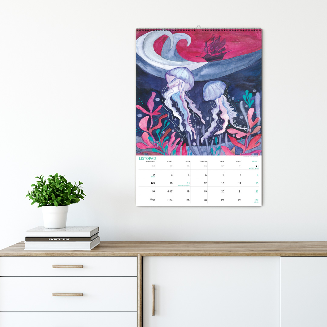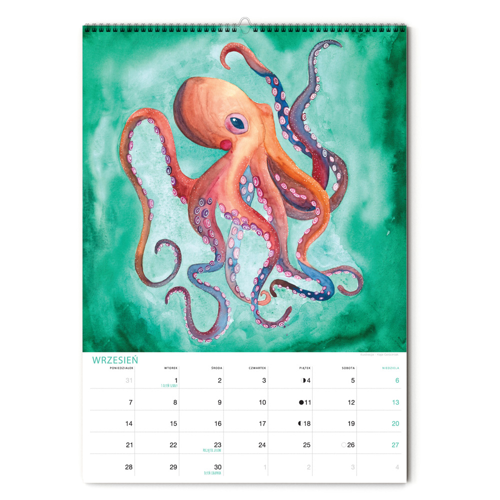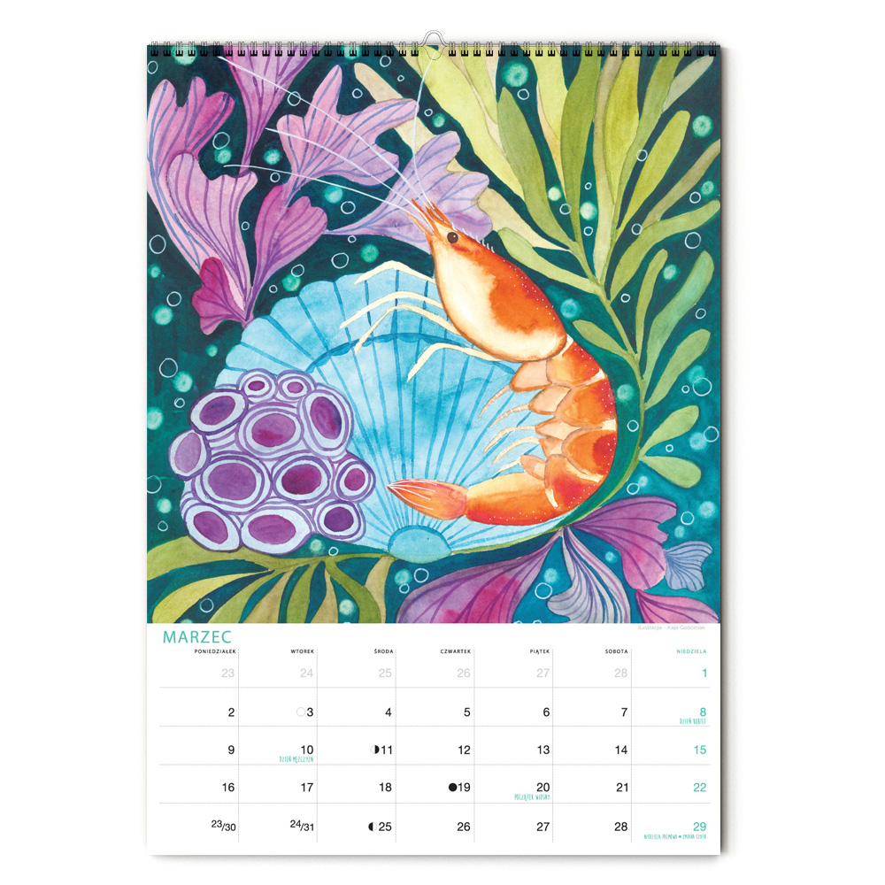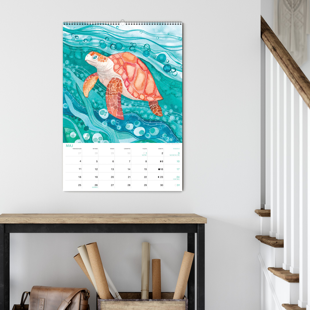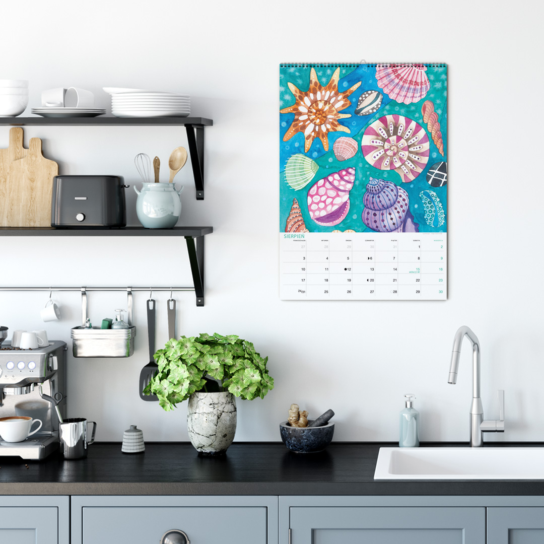 Kalendarz jest w formacie A3 i ma 12 ilustracji ze zwierzętami nadmorskimi oraz tymi żyjącymi w podwodnym świecie. Nie zabraknie żółwia, ośmiornicy, koników morskich, muszli, kraba, krewetki, ryb, i wielu innych stworzeń zamieszkujących morza i wybrzeża oceanów. Miejsce na notatki umożliwia przyjemne planowanie miesiąca. Jest pakowany w tekturową kopertę, by można dać go na prezent. Na koniec miesiąca można wyciąć ilustrację, oprawić w ramę i powiesić na ścianie, by cieszyła oko cały rok.