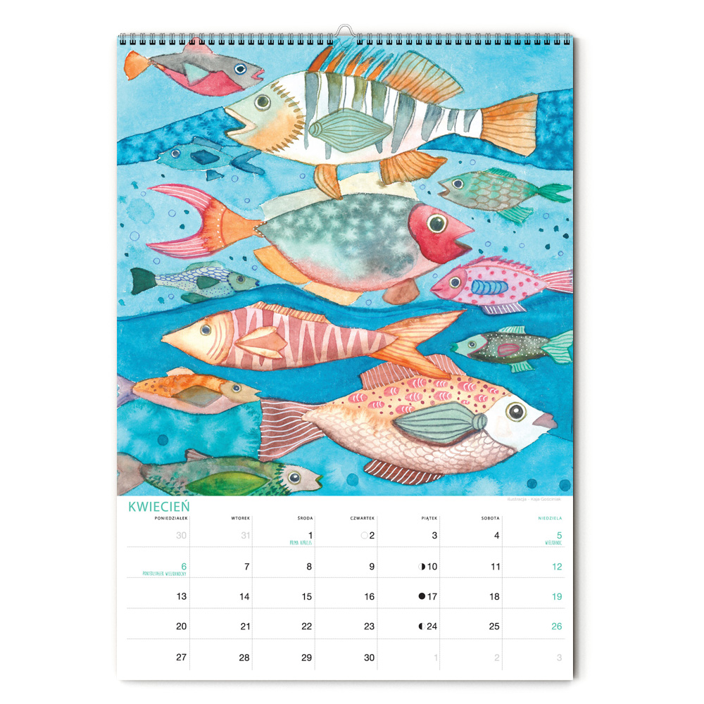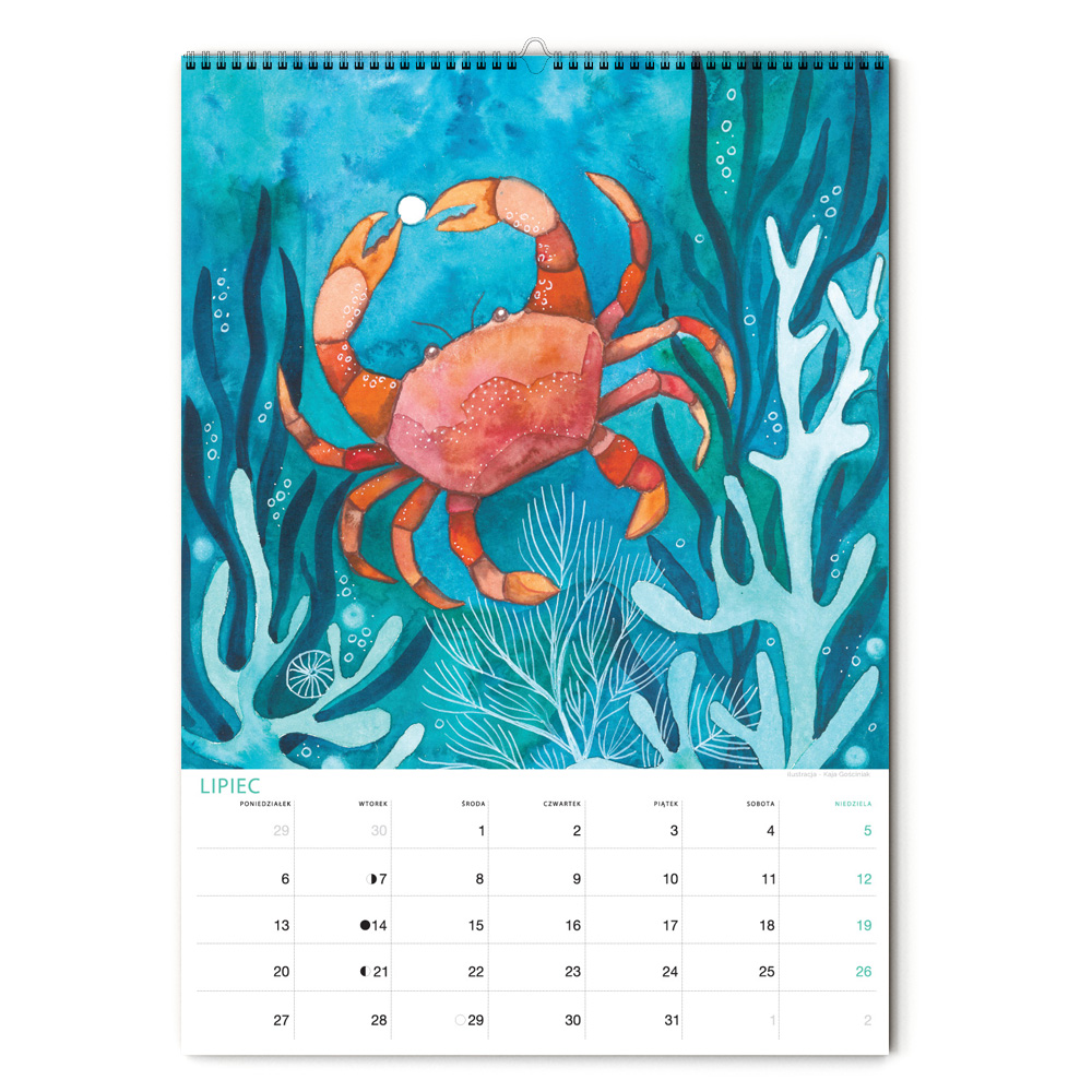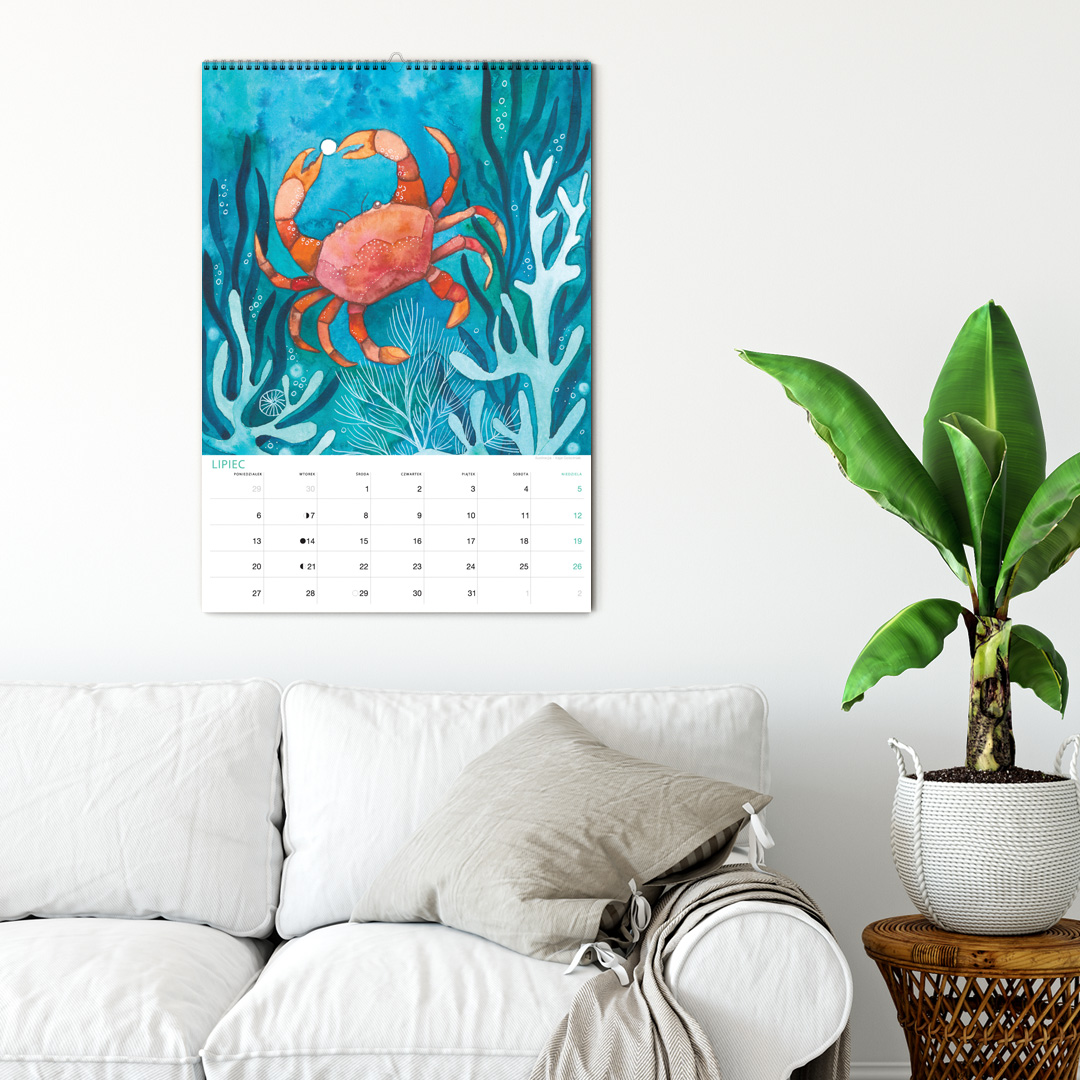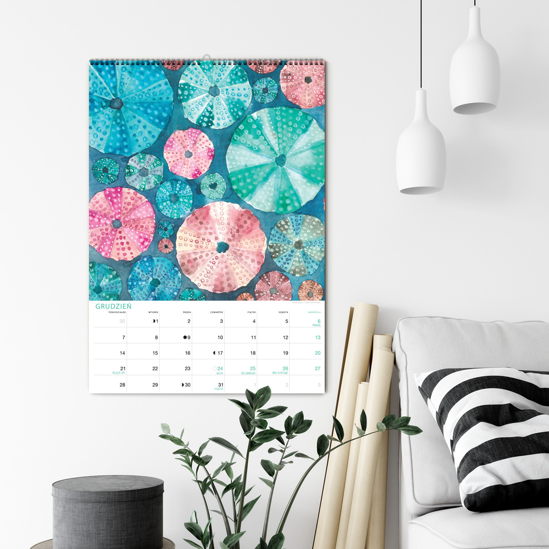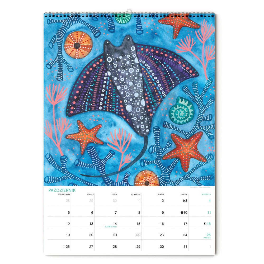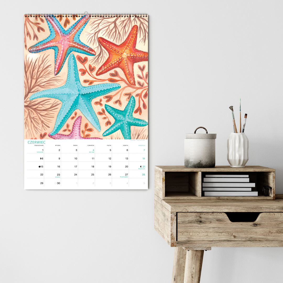 Kalendarz jest w formacie A3 i ma 12 ilustracji ze zwierzętami nadmorskimi oraz tymi żyjącymi w podwodnym świecie. Nie zabraknie żółwia, ośmiornicy, koników morskich, muszli, kraba, krewetki, ryb, i wielu innych stworzeń zamieszkujących morza i wybrzeża oceanów. Miejsce na notatki umożliwia przyjemne planowanie miesiąca. Jest pakowany w tekturową kopertę, by można dać go na prezent. Na koniec miesiąca można wyciąć ilustrację, oprawić w ramę i powiesić na ścianie, by cieszyła oko cały rok.