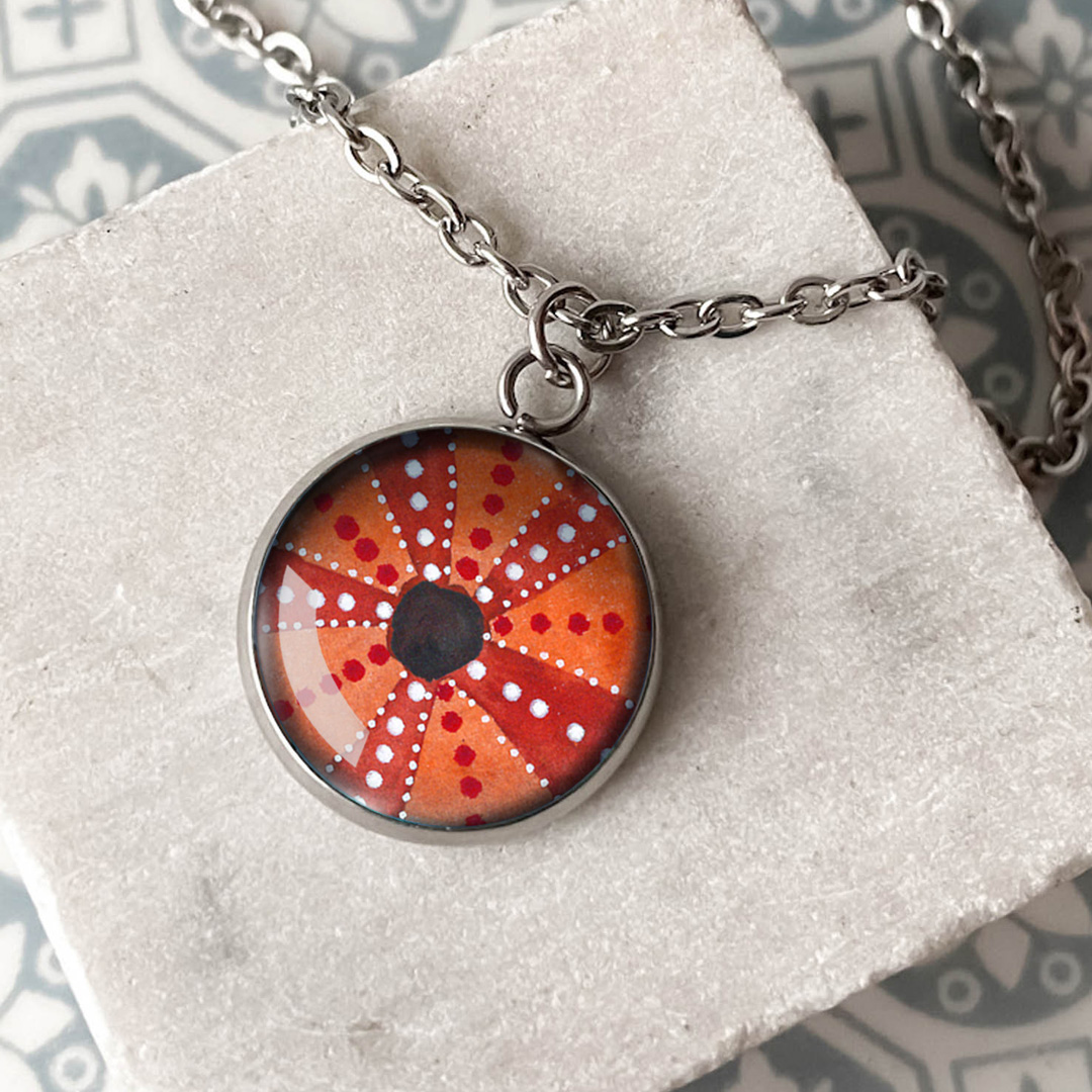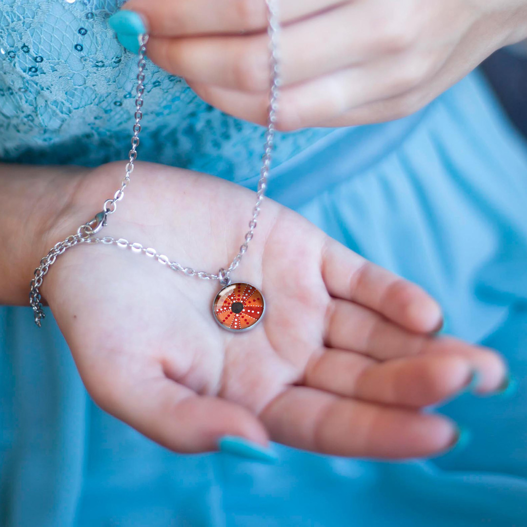 Naszyjnik z medalionem z kolekcji „Morski Świat”, w którym umieszczona jest kolorowa, autorska ilustracja pod szkiełkiem – elegancki i kobiecy dodatek, który idealnie wpisuje się w duch stylu casual.