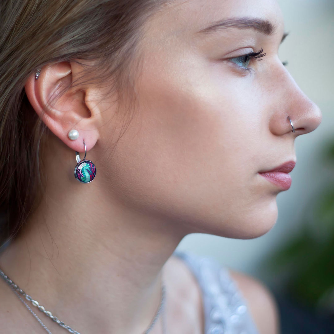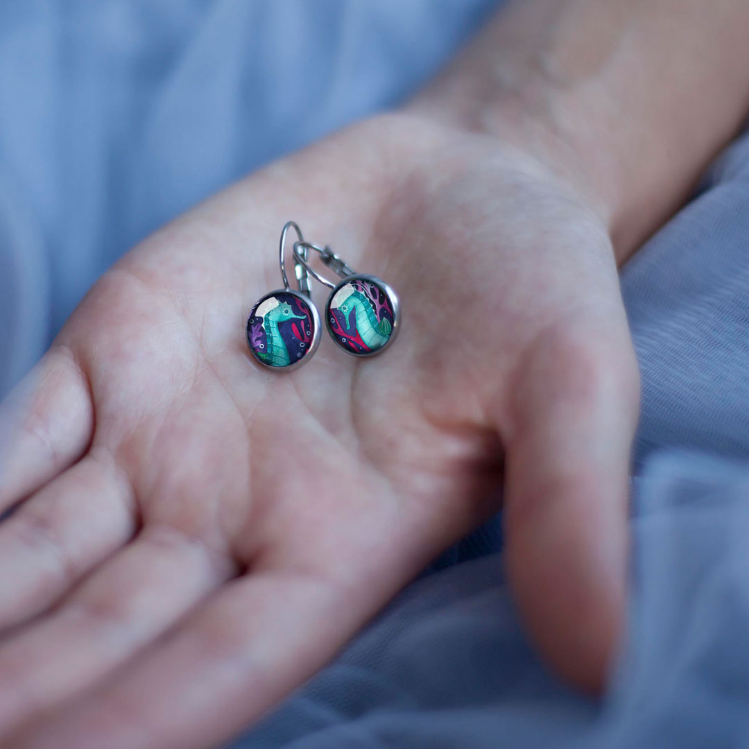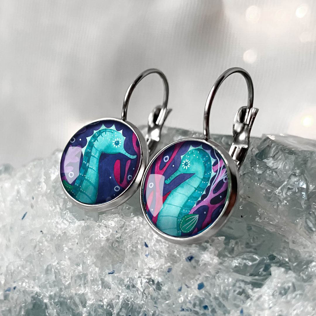 Kolczyki wiszące z kolorową, autorską ilustracją z serii Morski Świat
